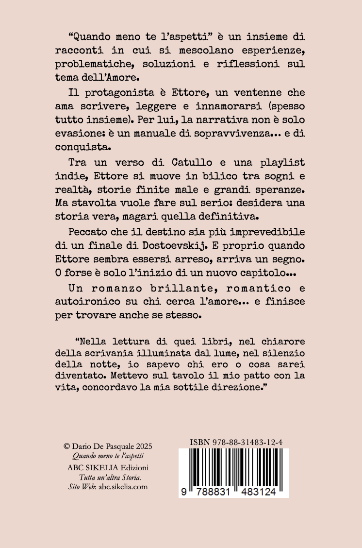 Quando meno te l’aspetti” è un insieme di racconti in cui si mescolano esperienze, problematiche, soluzioni e riflessioni sul tema dell’Amore.